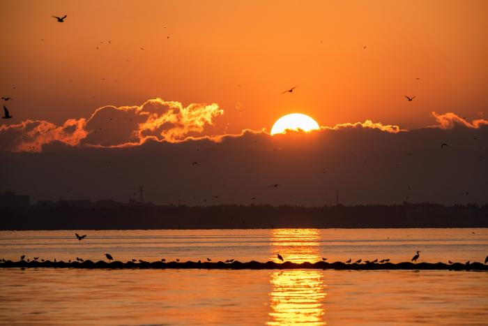图为2024年1月1日在云南省昆明市滇池边拍摄的日出。新华社记者 胡超 摄