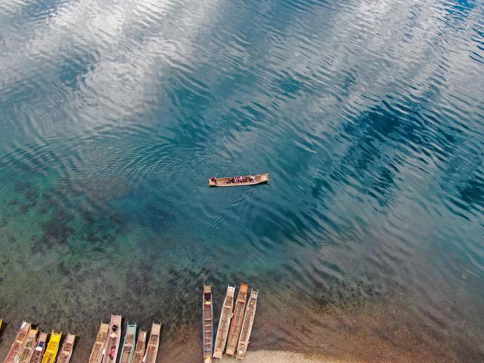 2023年5月2日,游客在云南省丽江市宁蒗彝族自治县境内的泸沽湖乘船游览(无人机照片)。新华社发(李云生 摄)