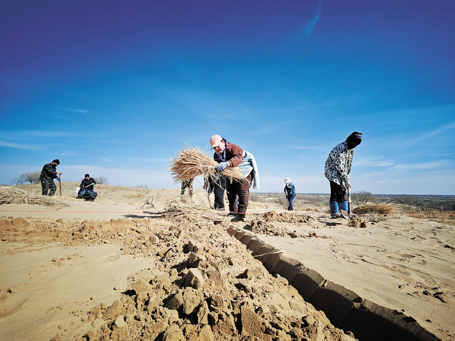 战沙现场,各种装备齐亮相,多支队伍奔赴前线,一派繁忙景象。铲车、钩机平整土地、挖树坑,拖拉机、无人机运送稻草、苗木,压沙机、扦插机器人埋沙障、插黄柳,农牧民群众、机关单位和企业干部职工齐上阵,扎沙障、植苗木。
