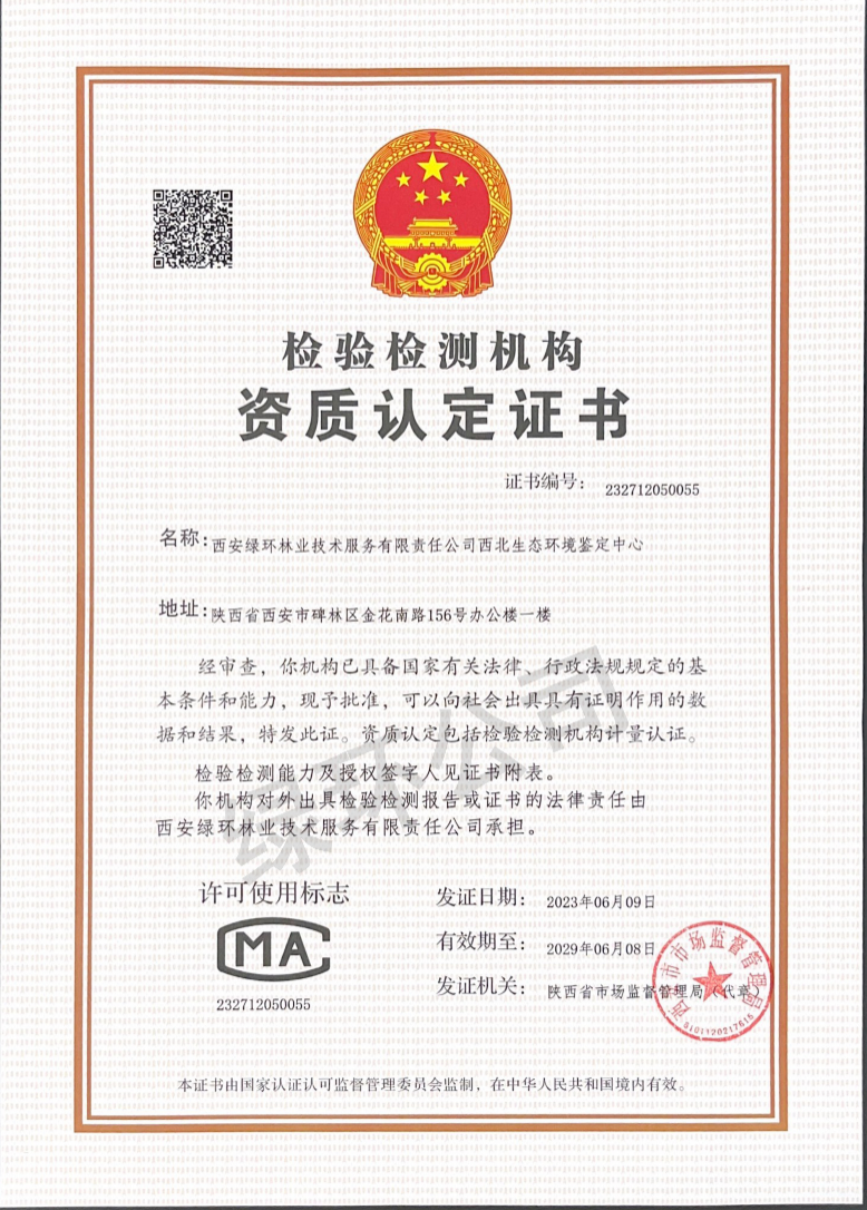 6月9日,西安绿环林业技术服务有限责任公司(以下简称“绿环公司”)西北生态环境鉴定中心获得了由陕西省市场监督管理局颁发的计量认证(CMA)资质认证(证书编号:232712050055),标志着西北生态环境鉴定中心正式与市场对接运营。