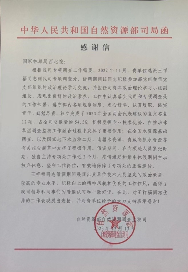 12月13日,自然资源部自然资源调查司发来感谢信,对我院的大力支持表示感谢,并对由我院借调的王祥福同志进行了表扬。