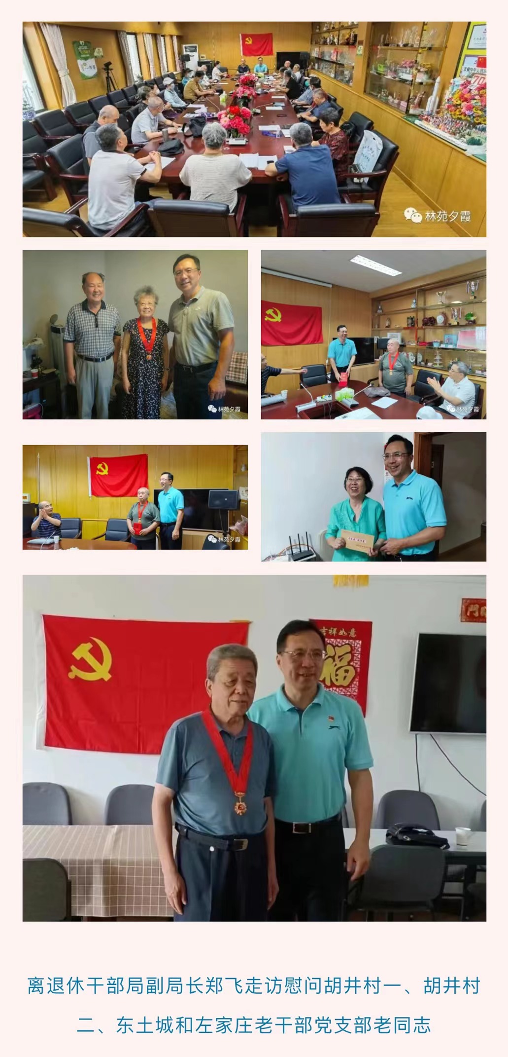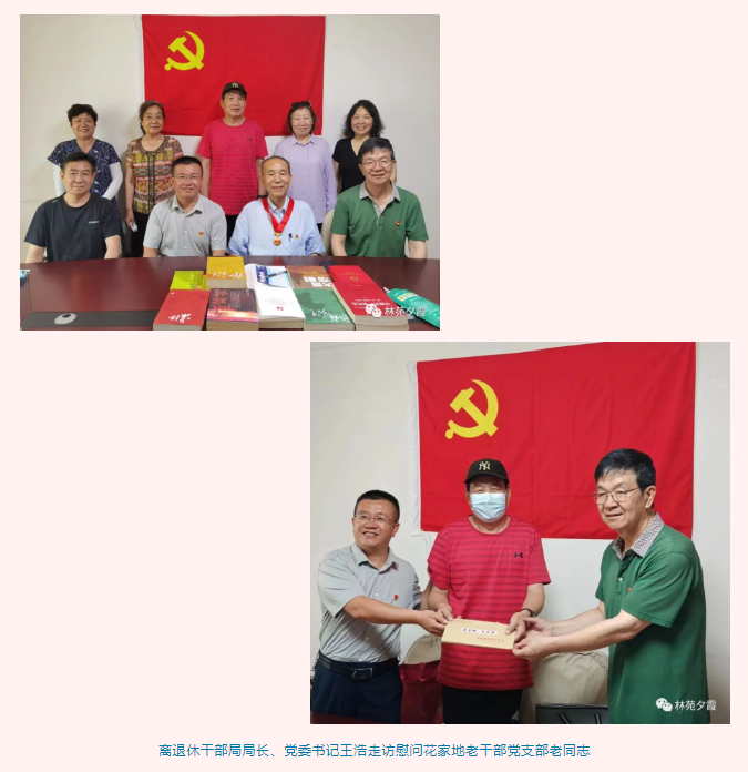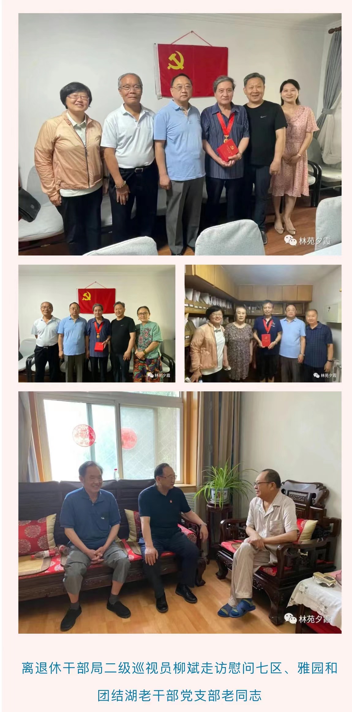 国家林草局离退休干部局认真贯彻落实国家林草局党组安排部署,扎实做好“七一”走访慰问工作。“七一”前夕通过“林苑夕霞”微信公众号向全体老党员、老领导、老同志推送慰问信,转达国家林草局党组对全体老同志的关心关爱和节日祝福,祝老党员、老领导、老同志节日快乐、健康长寿、阖家幸福。组织各党支部通过召开支部大会、开展党日活动,召开座谈会、茶话会、诗歌朗诵会,举办“光荣在党50年”纪念章颁发、重温入党誓词、过“政治生日”等政治仪式,采用电话、网络、微信、视频问候,登门拜访等多种方式开展走访慰问活动,重点走访慰问了获得党内功勋荣誉表彰的党员、新中国成立前入党的老党员、生活困难党员。