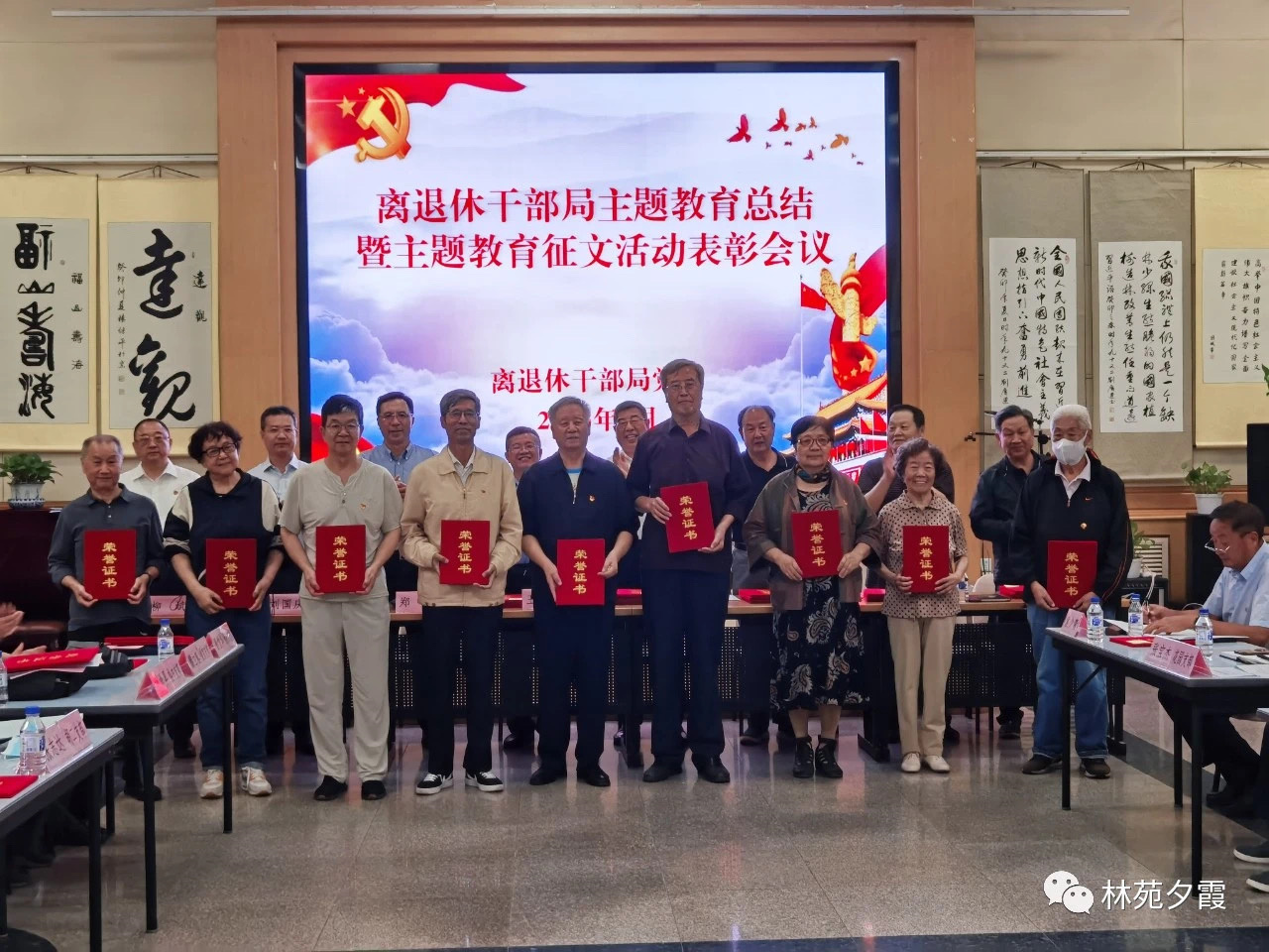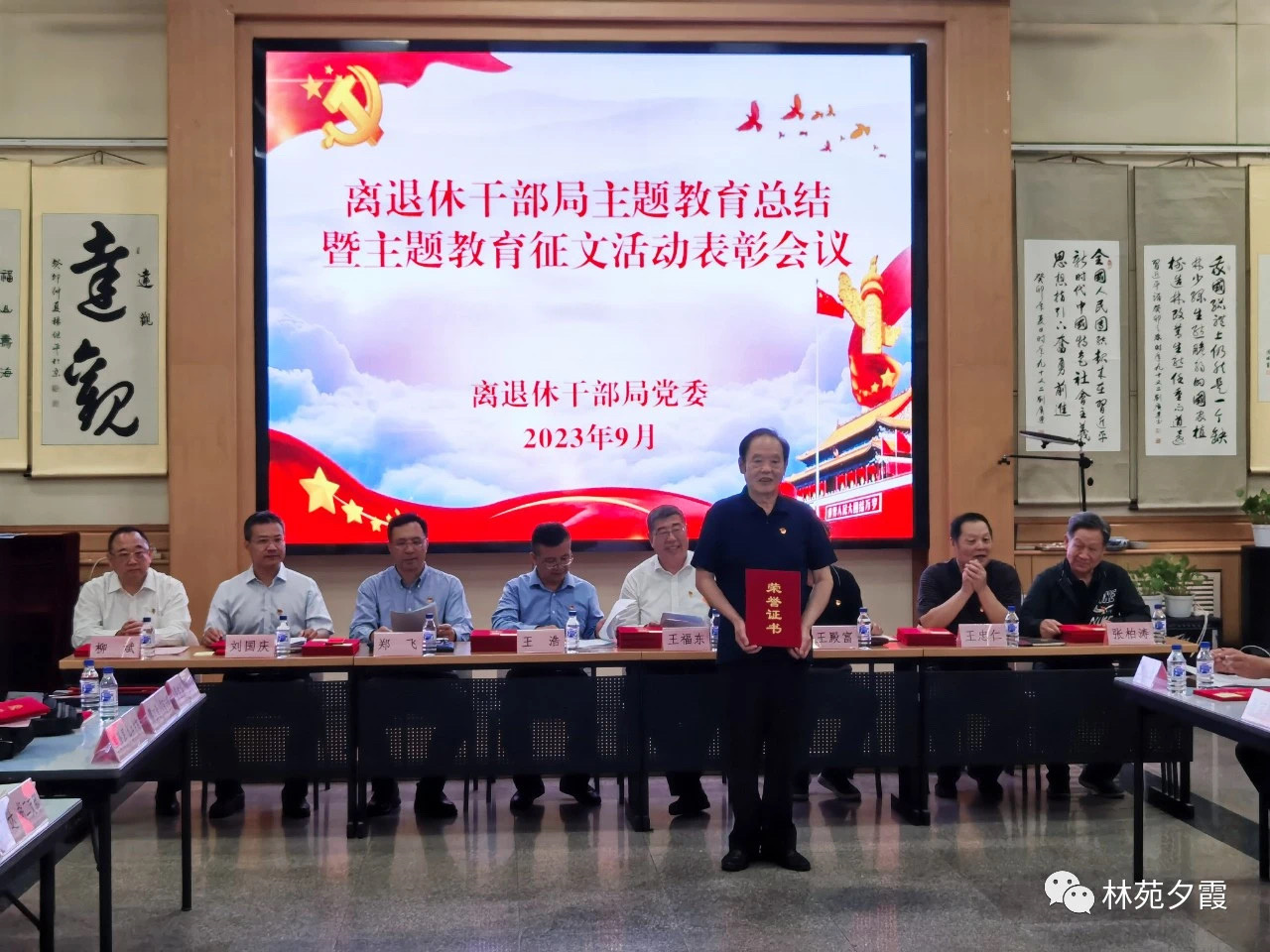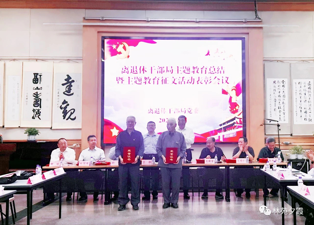 会议组织观看了离退休干部局党委主题教育总结汇报片,宣读了《离退休干部局党委关于表彰主题教育征文活动优秀作品的通报》。离退休干部局党委书记、局长王浩,党委副书记、纪委书记、一级巡视员王福东,副局长郑飞、刘国庆,二级巡视员柳斌,离退休干部局老干部党委委员王殿富、王忠仁、张柏涛等同志为获奖代表颁发了荣誉证书。