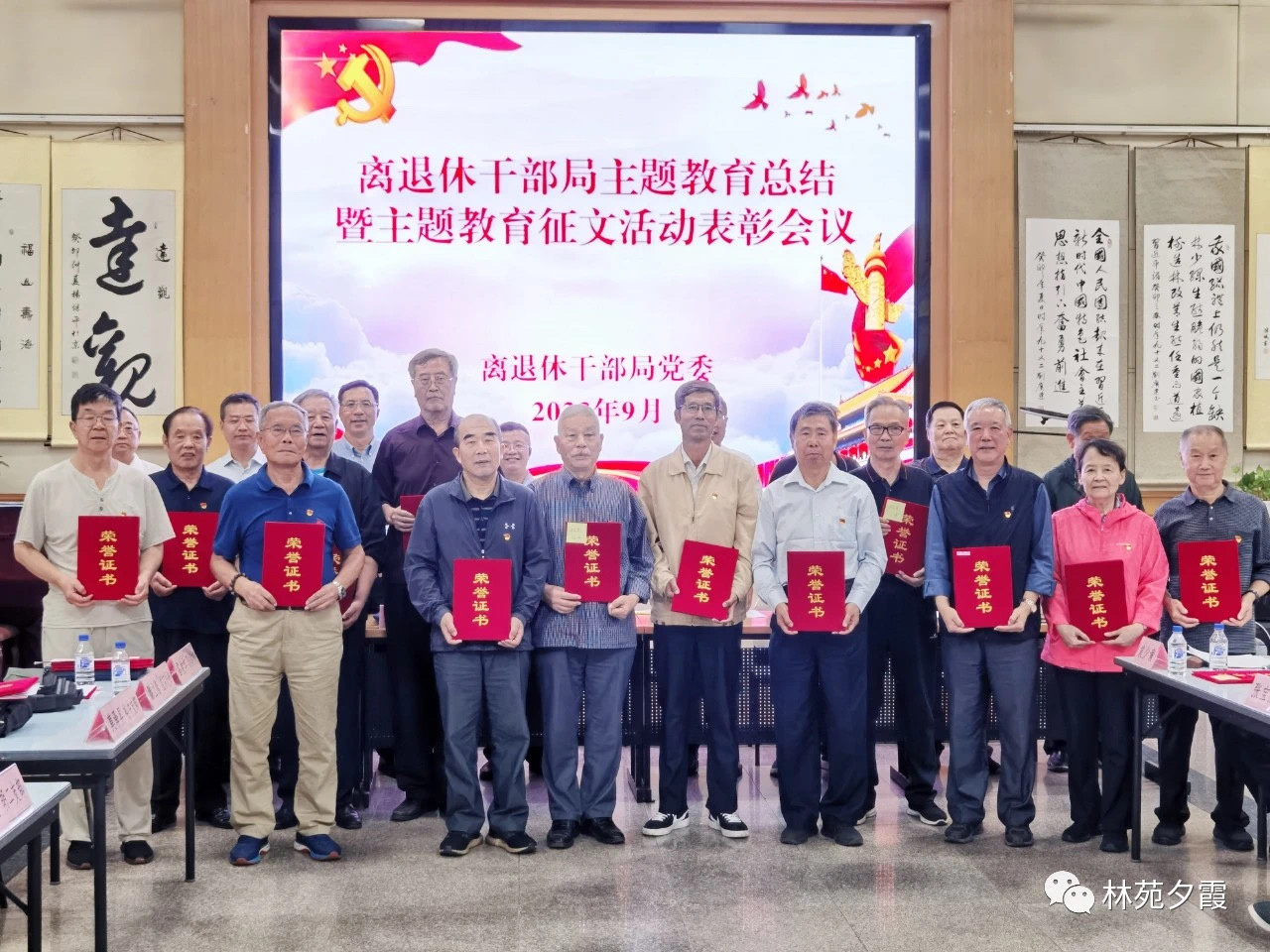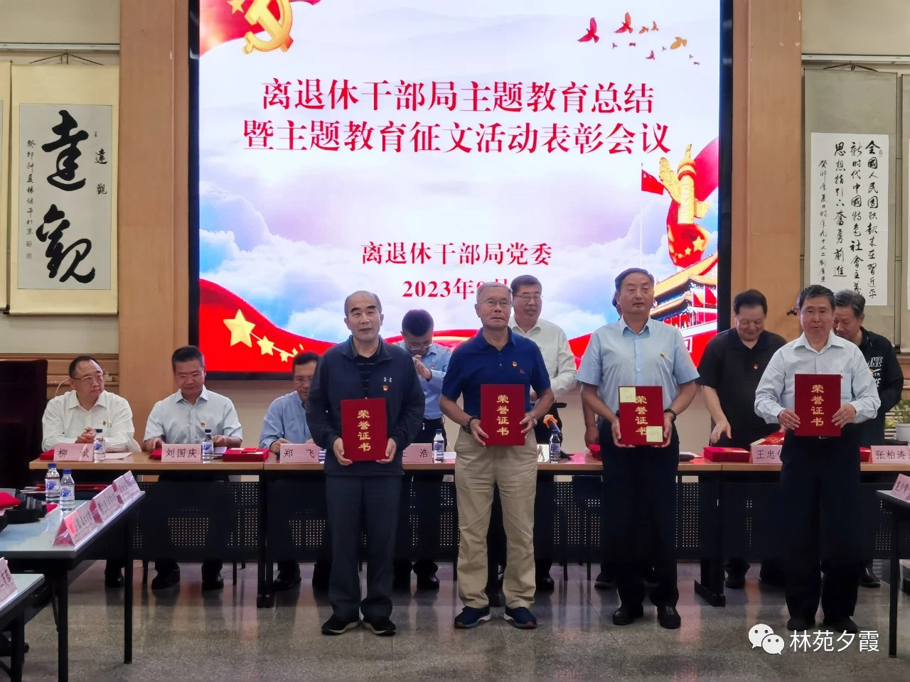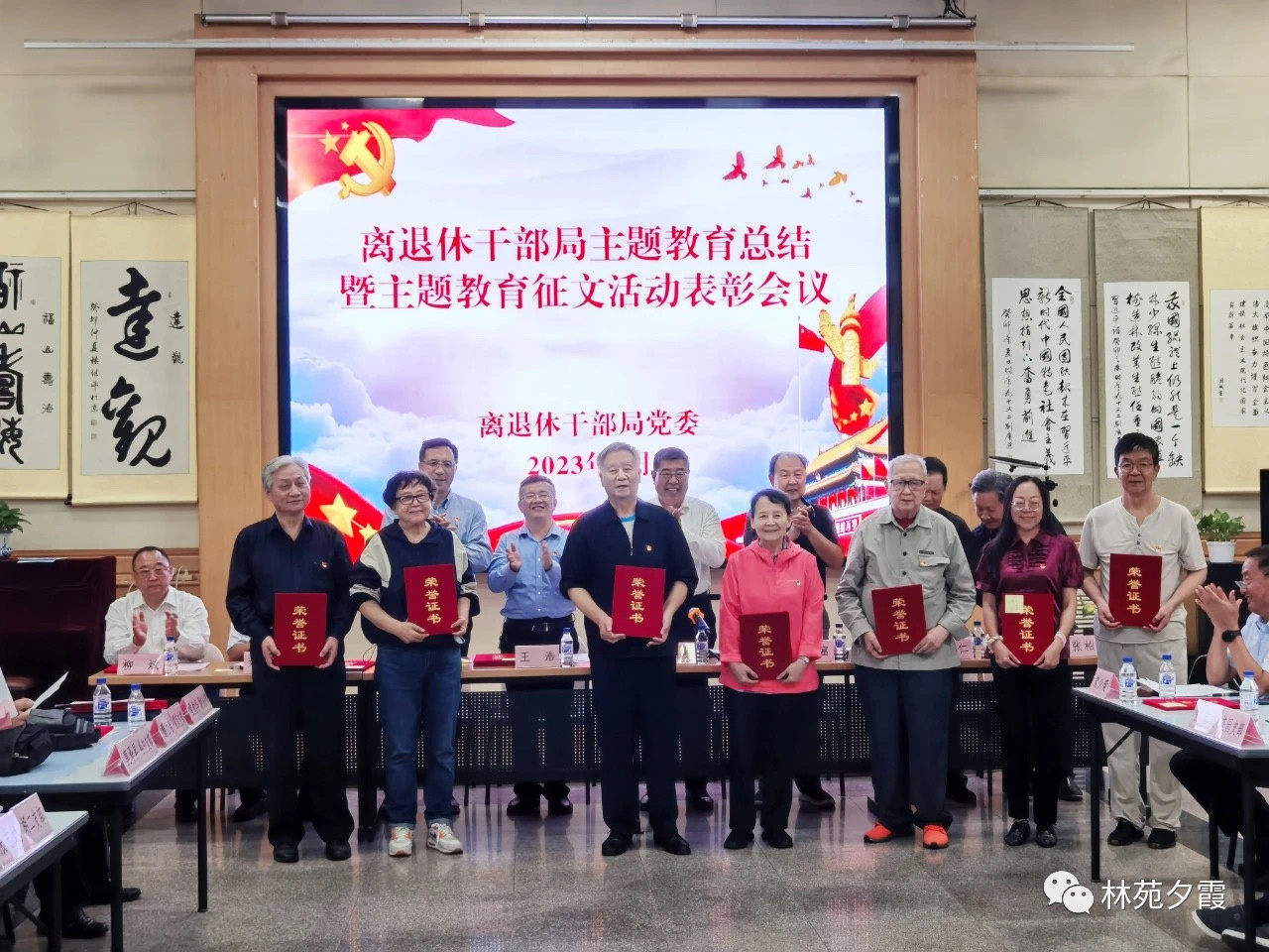 会议组织观看了离退休干部局党委主题教育总结汇报片,宣读了《离退休干部局党委关于表彰主题教育征文活动优秀作品的通报》。离退休干部局党委书记、局长王浩,党委副书记、纪委书记、一级巡视员王福东,副局长郑飞、刘国庆,二级巡视员柳斌,离退休干部局老干部党委委员王殿富、王忠仁、张柏涛等同志为获奖代表颁发了荣誉证书。