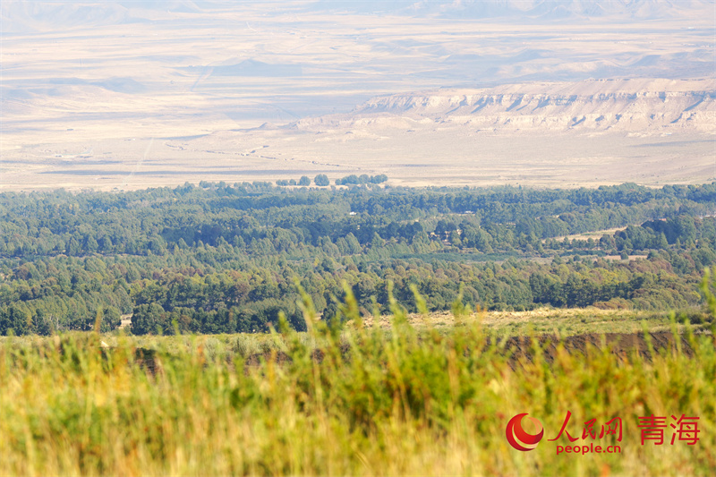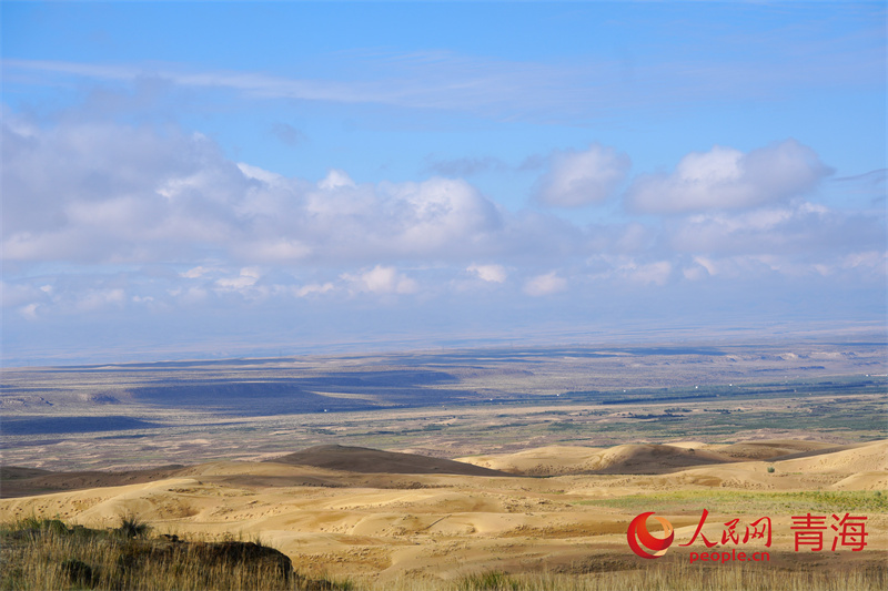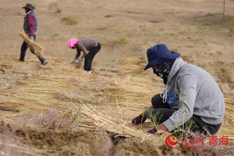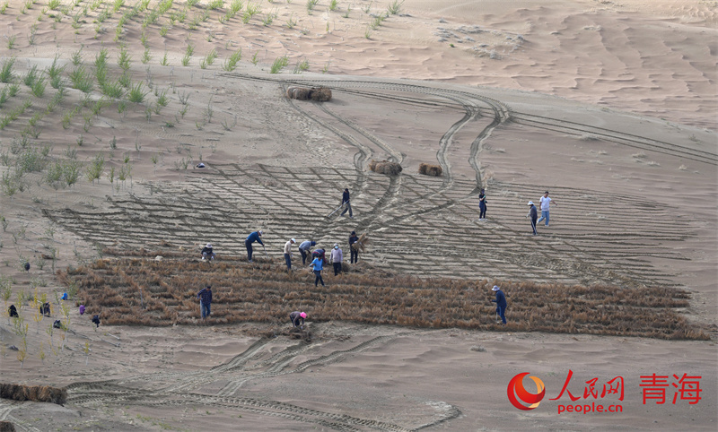 秋日的青海省海南藏族自治州共和县中部、塔拉滩沙漠边缘的沙珠玉乡,远远望去,一片片村庄掩映在高大的青杨、乌柳之间。近处的沙丘上柠条、梭梭迎风茁壮生长。沙珠玉当地群众在荒漠化区域制作草方格,开始新一轮治沙工作。